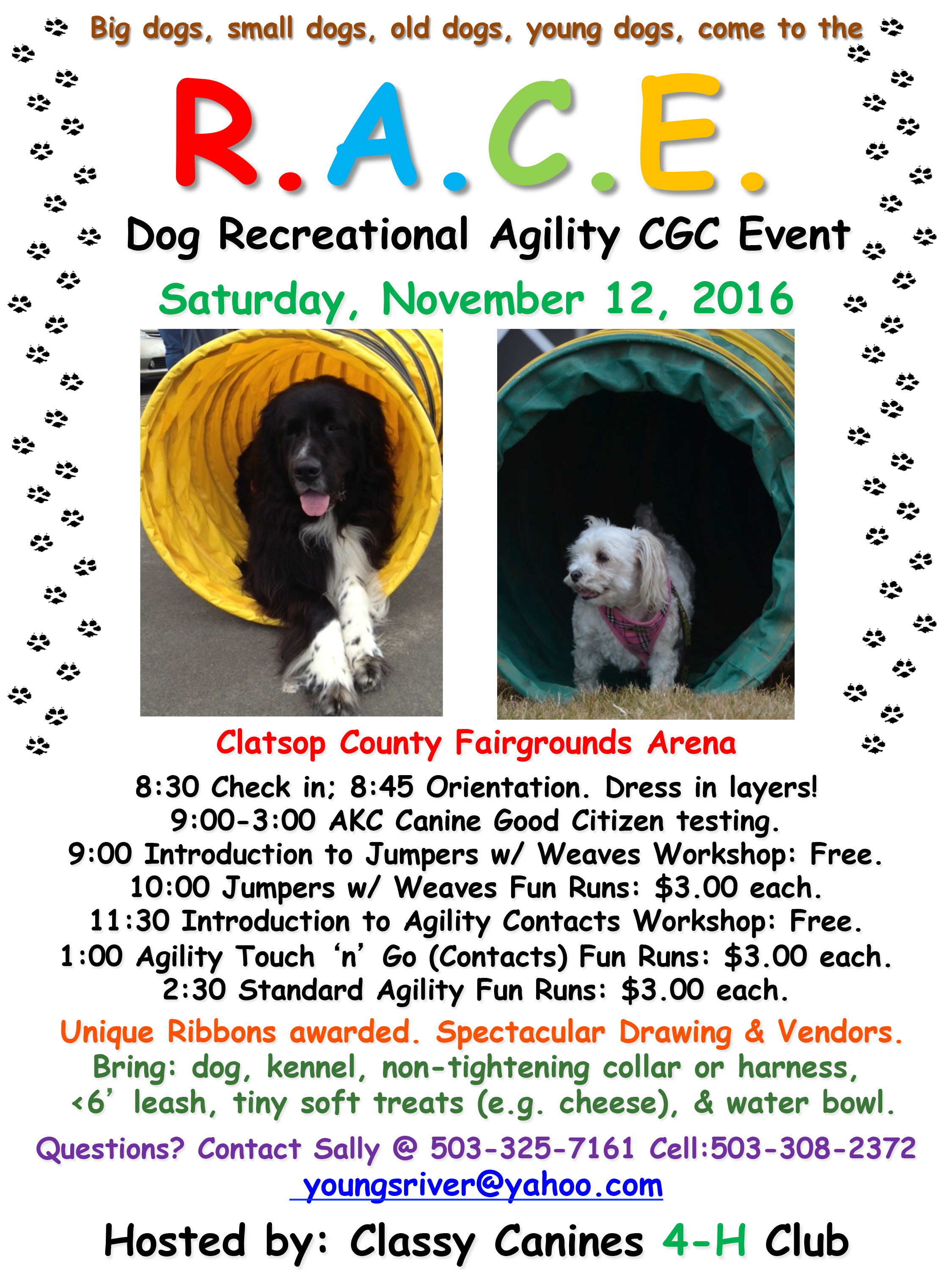 Agility runs. Learn how to incorporate the different Agility obstacles into your dog's repertoire! Arnicadia will be offering CGC and CGCA testing at the event as well as having a fun Rally Obedience course set up for breaks!